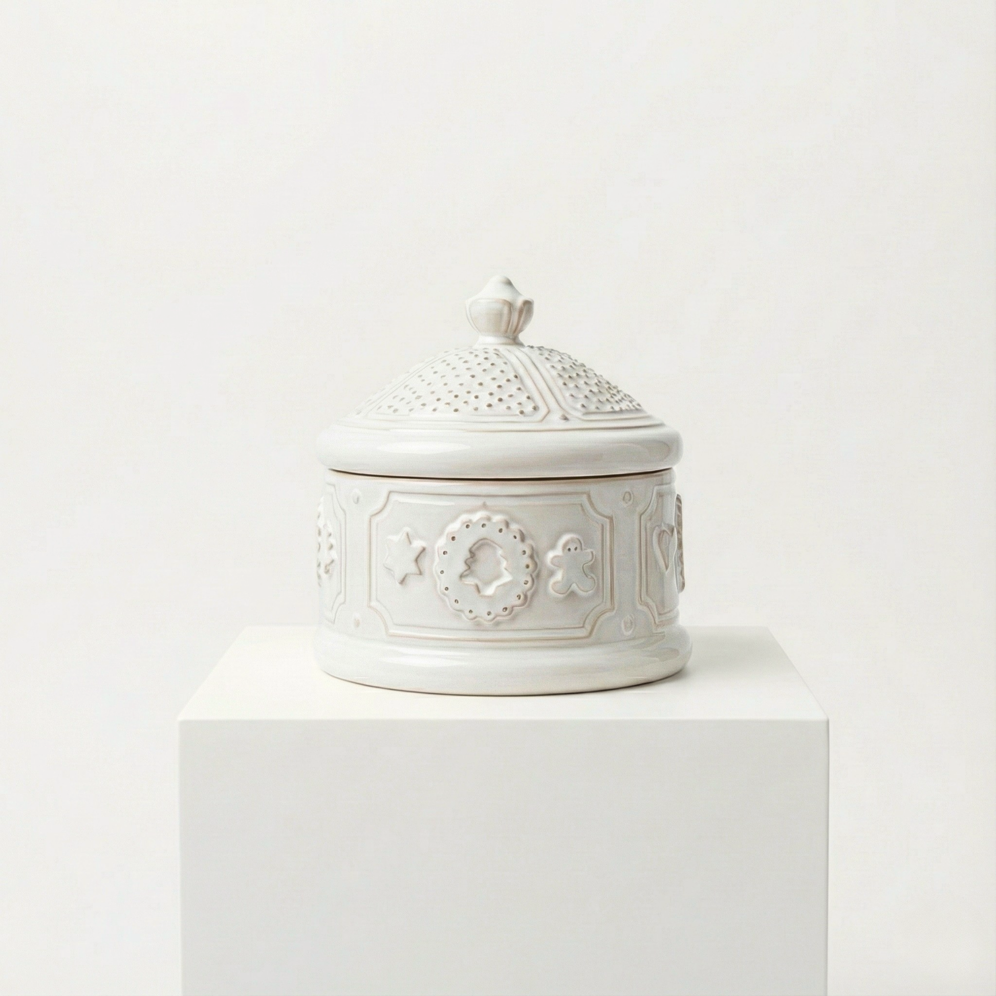 Reljefiniai sausainių ir žvaigždučių raštai sukuria žaismingą, nostalgišką nuotaiką. Tinka smulkmenoms, saldainiams ar šventinėms paslaptims saugoti.